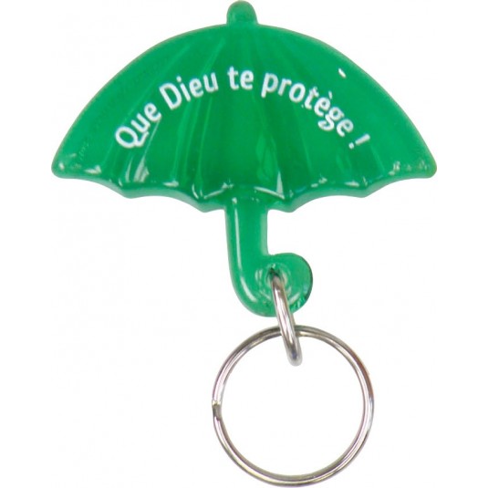 Potre-clés en forme de parapluie avec le texte suivant : «Que Dieu te protège !»