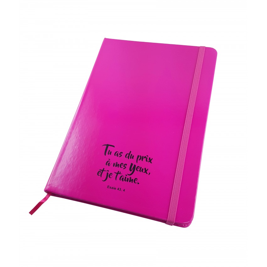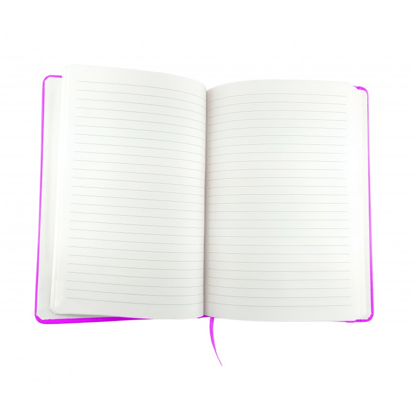 Carnet de notes rose fluo, DIN A5, 80 pages lignées, papier crème, avec signet et élastique.
