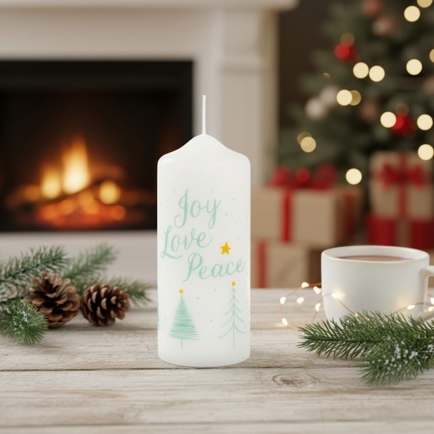 Jolie bougie décorative blanche avec motif sapins de Noël et le texte : Joy, Love, Peace tout autour.