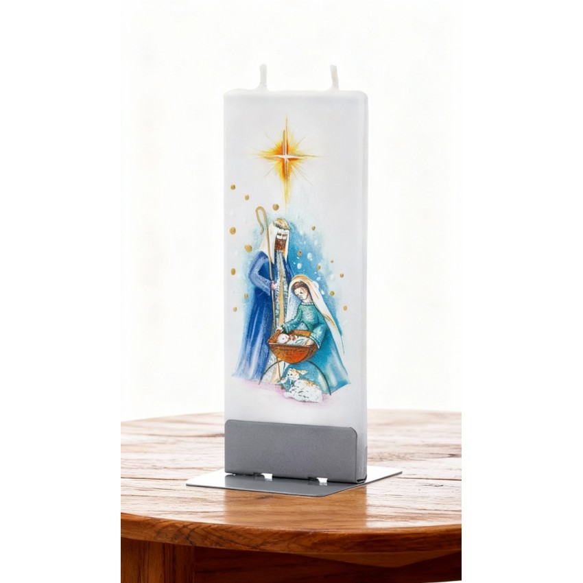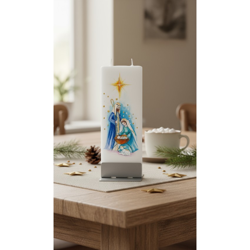 Bougie plate Jésus, Marie, Joseph et étoile peinte à la main.