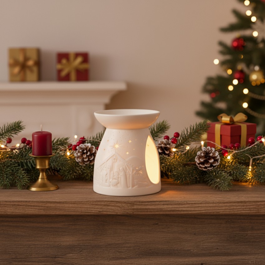 La lampe aromatique en porcelaine blanche mate Crèche crée une atmosphère de Noël chaleureuse dans la maison. Idéale aussi pour l'offrir en cadeau pour les fêtes de fin d'année.