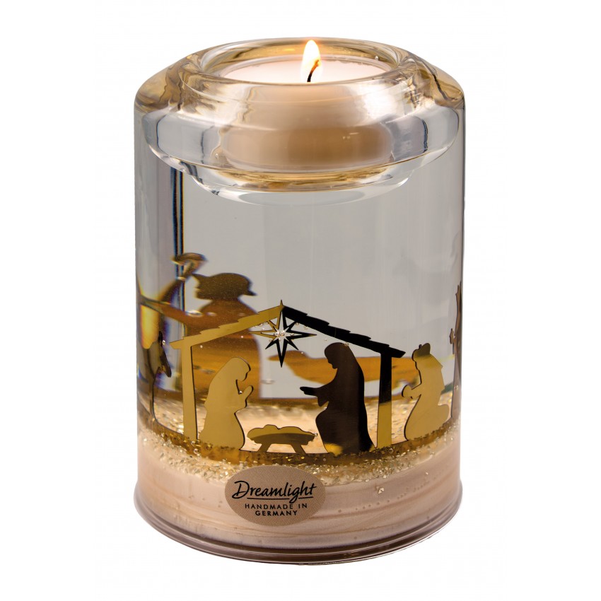 Ce photophore raffiné présente une crèche en métal doré brillant, délicatement travaillée, sublimée par un socle couleur champagne et une pluie de paillettes dorées scintillantes. La lumière de la bougie révèle toute la beauté de cette scène, créant une ambiance chaleureuse et festive.