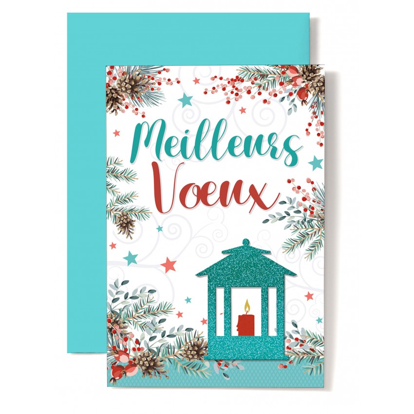 Carte double Meilleurs Voeux lanterne verte et bougie rouge