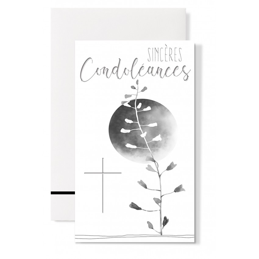 Jolie carte de condoléances double grand format avec branche devant lune et croix.