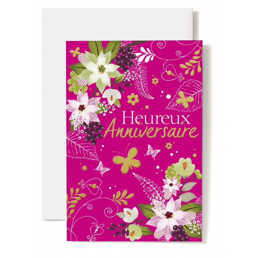 Jolie carte double grand format "Heureux Anniversaire" avec fleurs dessinées sur fond rose.