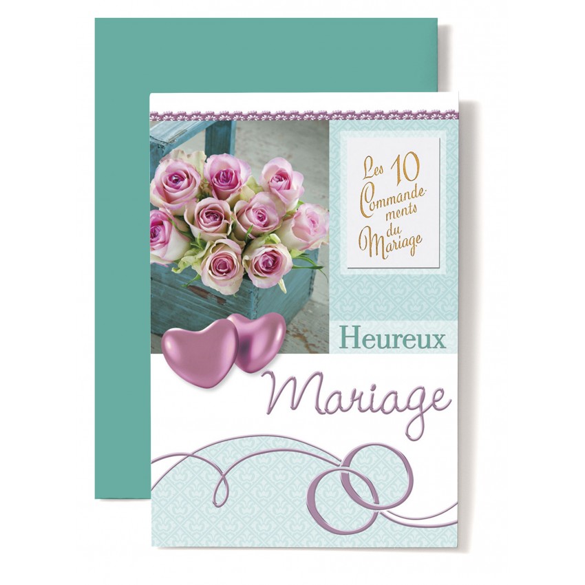 Jolie carte double de félicitation pour le mariage avec des coeurs roses et un bouquet de...