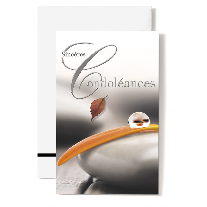 Jolie carte double de condoléance avec une goutte d'eau sur une feuille et un galet