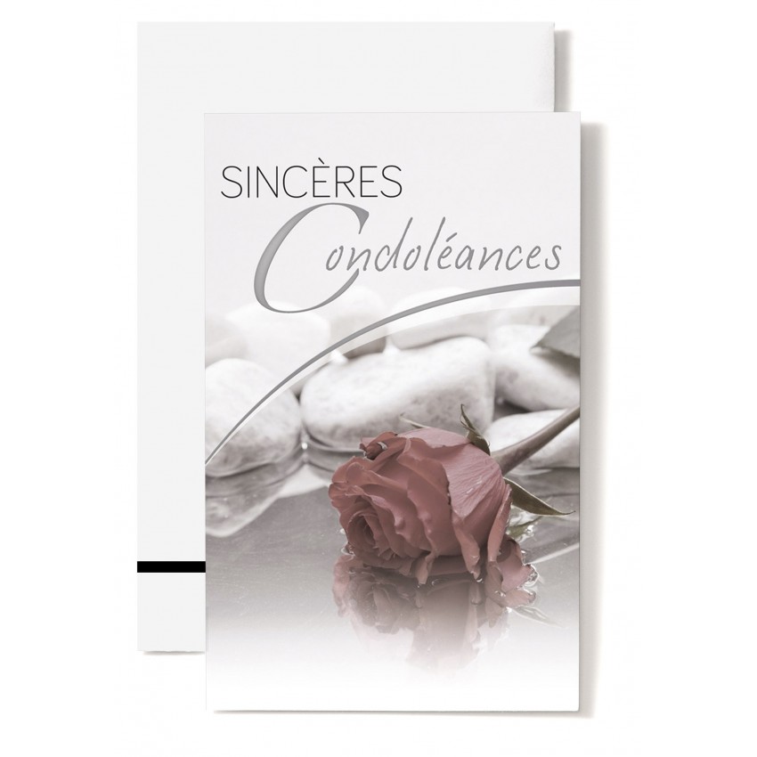 Jolie carte double de condoléance avec une rose rose et des galets