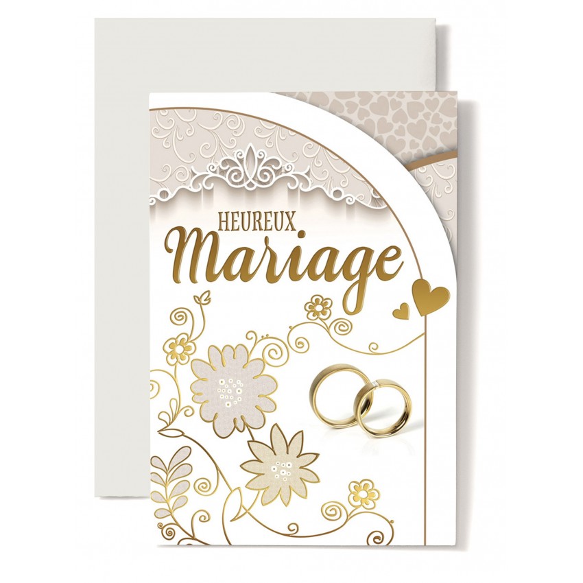 Jolie carte double de félicitation pour le mariage avec des coeurs dorés et un bouquet de...