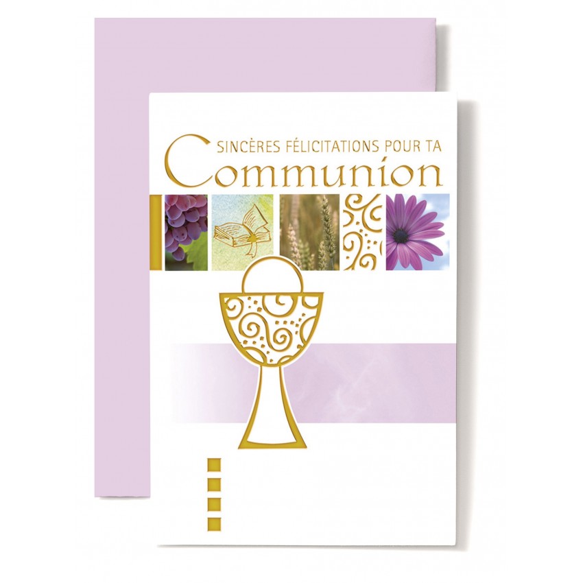 Jolie carte double de félicitation pour la communion avec une coupe, une colombe et un poisson...