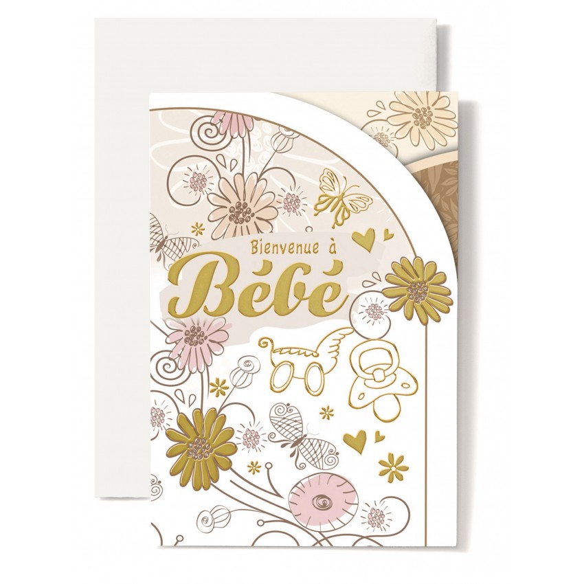 Jolie carte double de félicitation pour une naissance avec une tétine et un landeau doré,...