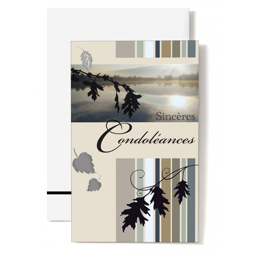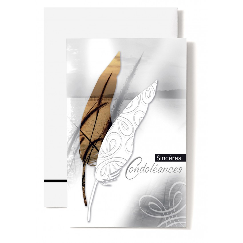 Jolie mignonnette double de condoléance avec des roseaux et des plumes, ainsi que le message...