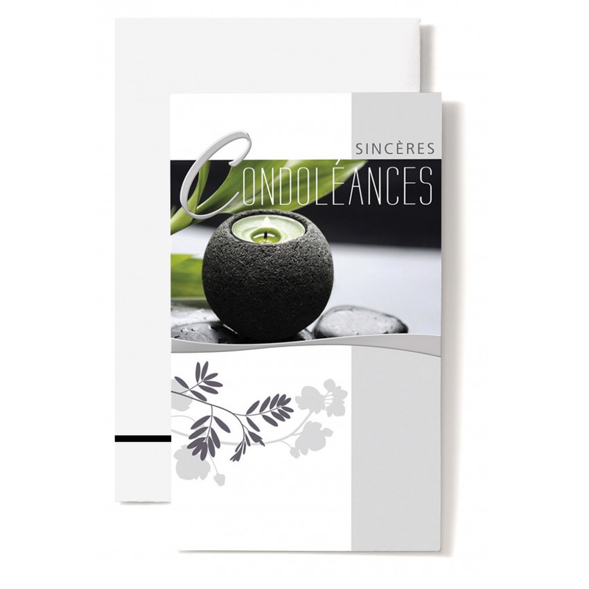 Jolie carte postale double de condoléance avec une bougie verte et noire, un galet et feuilles...