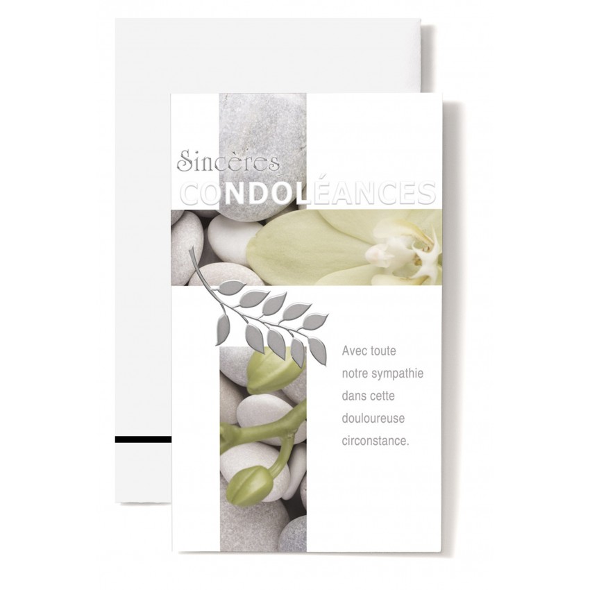 Jolie carte postale double de condoléances avec croix décor galets et fleur et le message...