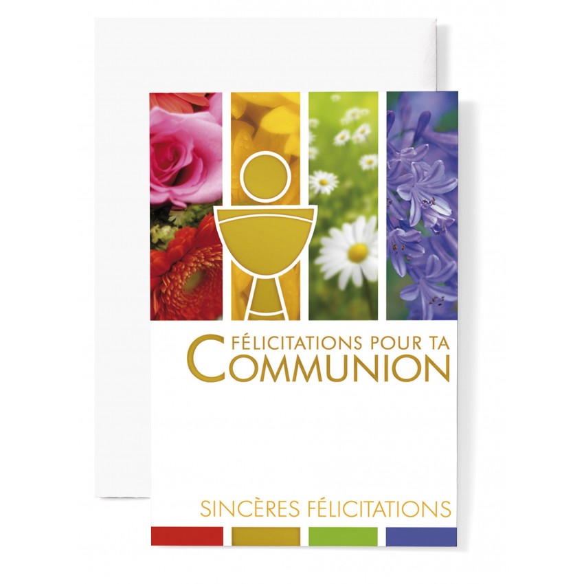 Jolie carte postale double de communion avec coupe avec margueritte,fond nuage et le message...