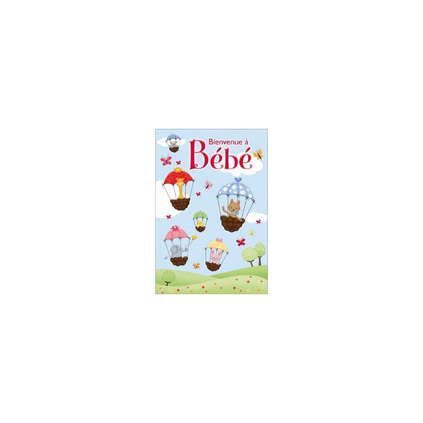 Jolie carte double grand format "Bienvenue à bébé" avec des animaux dans des parachutes sur...
