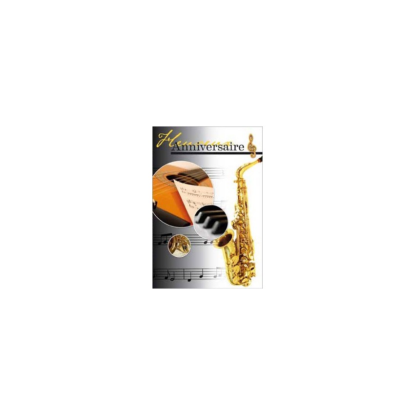Jolie carte double grand format "Heureux Anniversaire" avec un saxophone et une guitare. La...