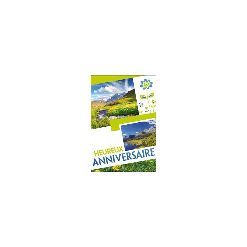Jolie carte double grand format "Heureux Anniversaire" avec des paysages de montagne. La carte...