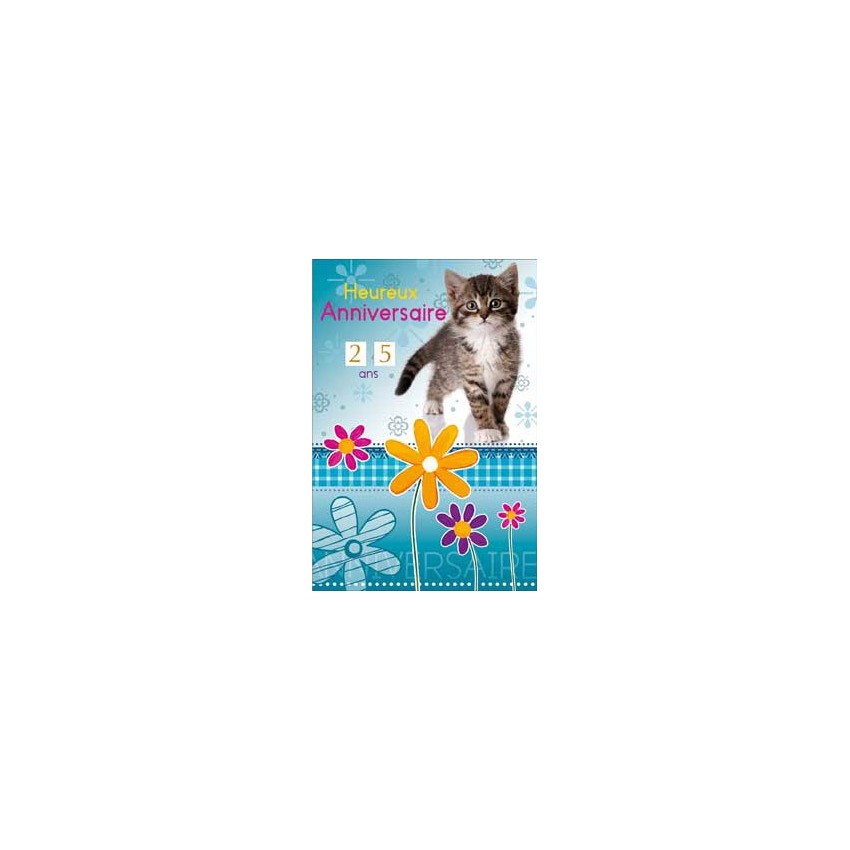 Jolie carte double grand format "Heureux Anniversaire" avec un chat gris. La carte est...
